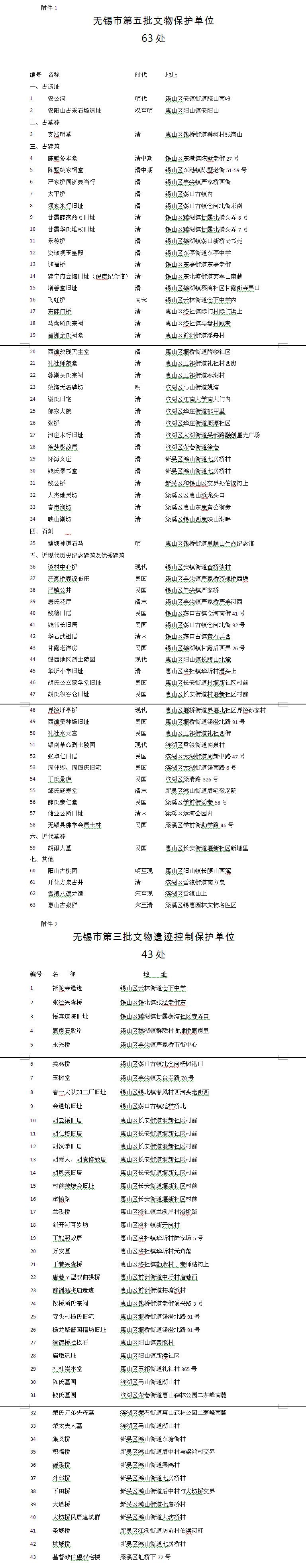 《無錫市第五批文物保護單位》(63處)《無錫市第三批文物遺跡控制保護單位》(43處)和《已公布的市級文物保護單位擴充和更名項目》(3處)名單已經市政府批準,現予公布。