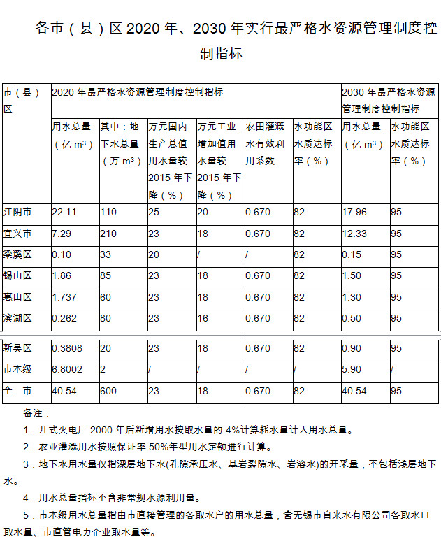 五、《市政府辦公室關于印發無錫市實行最嚴格水資源管理制度考核辦法的通知》(錫政辦發〔2014〕73號)中已下達各地的2020年實行最嚴格水資源管理制度控制指標與本方案指標不一致的,按照本方案指標執行。