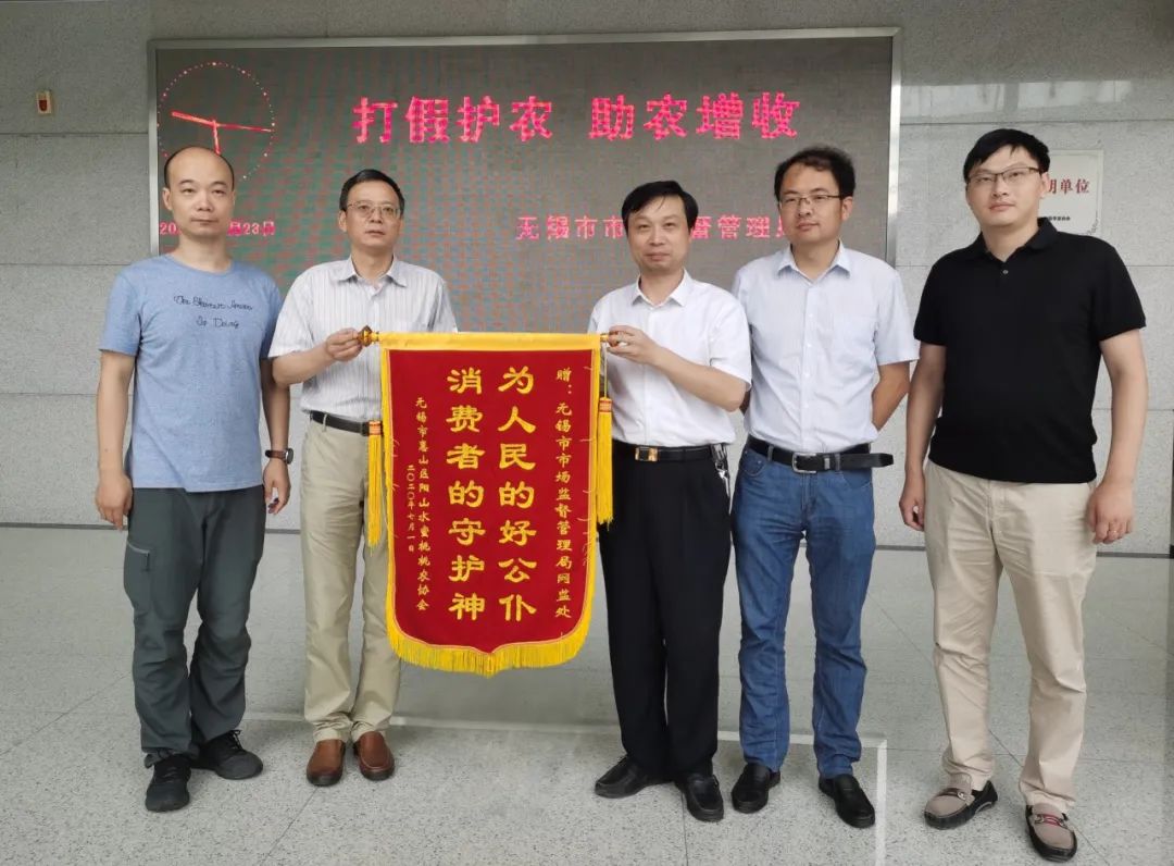 7月24日,無錫市陽山水蜜桃桃農協會為市場監管局網監處送來錦旗,感謝市場監管局整頓網絡銷售秩序、維護桃農合法權益。