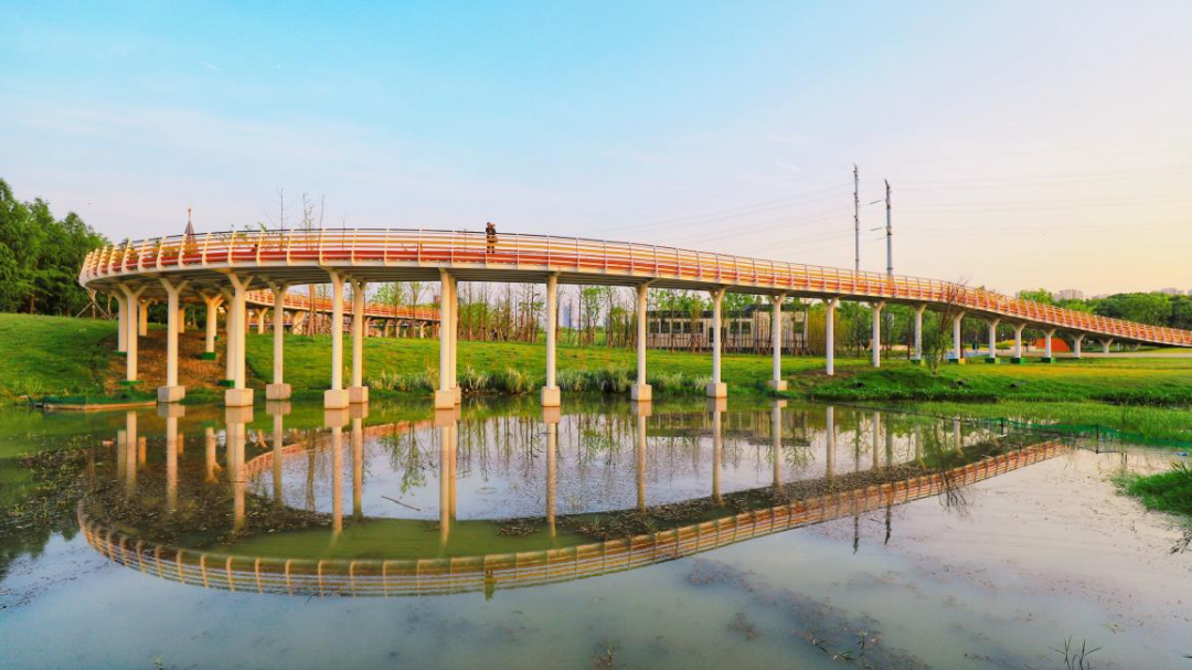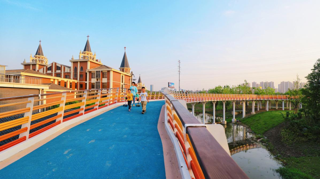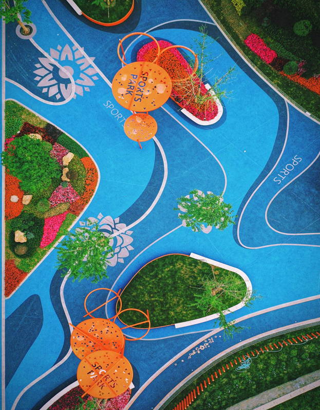 以天空藍(lán)顏色為主基調(diào)的健身步道貫穿整個(gè)云林生態(tài)體育公園,總長(zhǎng)2600米,這里可徒步,可騎行,可樂跑。不用加任何濾鏡,就能輕松拍出各式美照。