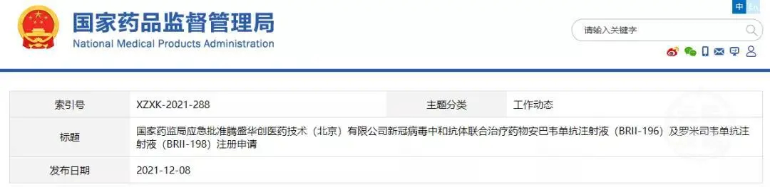 當天,國家藥品監(jiān)督管理局應急批準騰盛華創(chuàng)醫(yī)藥技術(shù)(北京)有限公司新冠病毒中和抗體聯(lián)合治療藥物安巴韋單抗注射液(BRII-196)及羅米司韋單抗注射液(BRII-198)注冊申請,這是我國首個獲批的自主知識產(chǎn)權(quán)新冠病毒中和抗體聯(lián)合治療藥物。
