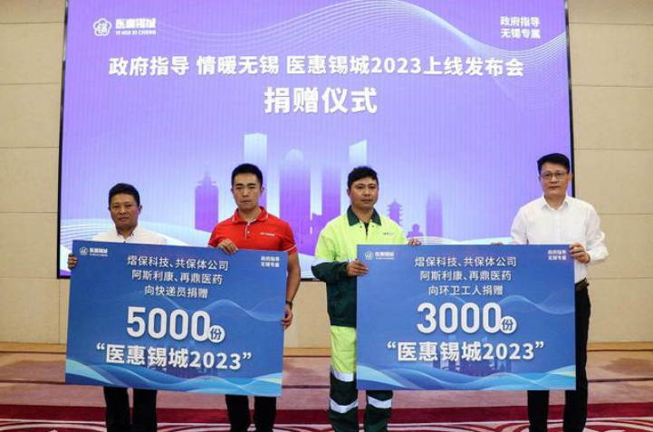 發布會上,無錫市人民政府副市長秦詠薪等領導共同啟動“醫惠錫城2023”,宣布無錫市普惠型商業補充醫療保險——“醫惠錫城2023”正式發布。隨后,熠保科技、共保體公司、阿斯利康、再鼎醫藥聯合向環衛員工、快遞員捐贈共8000份醫惠錫城2023產品。