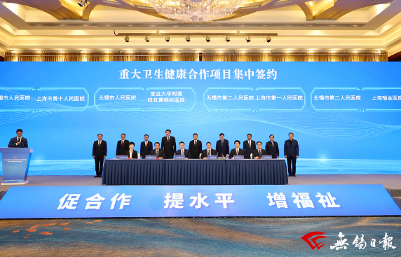 市人民醫院、市二院、江南大學附屬醫院、市中醫醫院、市精衛中心分別與上海市第十人民醫院、復旦大學附屬眼耳鼻喉科醫院、上海市第一人民醫院、上海瑞金醫院、應急總醫院、中山大學附屬孫逸仙紀念醫院、中藥制藥過程新技術國家重點實驗室、北京大學第六醫院,圍繞成立長三角泌尿外科聯盟無錫中心、無錫消化病診療中心、國家應急醫學研究中心(無錫分中心)、中山大學附屬孫逸仙醫院乳腺腫瘤中心無錫分中心、中藥制藥過程新技術國家重點實驗室無錫市中醫醫院研究所等簽約合作。