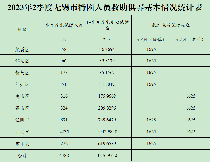 2023年二季度無錫市特困人員救助供養基本情況統計表