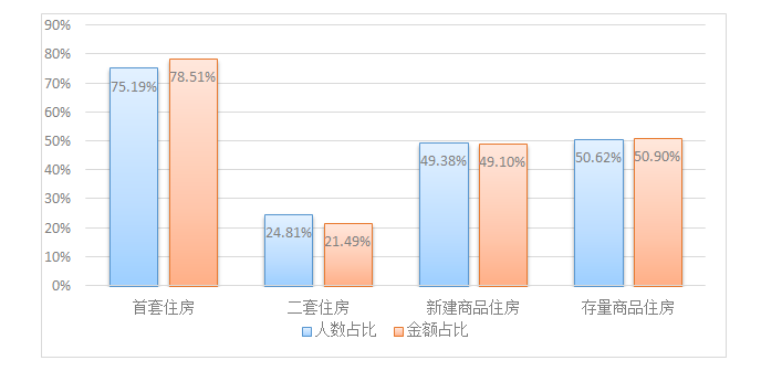 從貸款群體來看,剛需與改善型住房需求職工分別占貸款總?cè)藬?shù)的28.33%和64.49%。從單位性質(zhì)來看,以城鎮(zhèn)私營企業(yè)及其他城鎮(zhèn)企業(yè)職工為主,貸款筆數(shù)和貸款金額占比分別為58.09%、56.88%。從購房面積來看,職工貸款購買小于90㎡、90-120㎡房屋居多,分別占貸款總?cè)藬?shù)的28.33%、39.39%。從主借人繳存基數(shù)來看,貸款主要以中、低收入職工為主,分別占貸款總?cè)藬?shù)的27.19%、71.41%。從貸款類型來看,純公積金貸款和組合貸款占比分別為38.71%、61.29%。從貸款結(jié)構(gòu)來看,首套住房公積金貸款職工占貸款總?cè)藬?shù)的75.19%,二套住房公積金貸款人數(shù)占24.81%。具體放貸結(jié)構(gòu)如下: