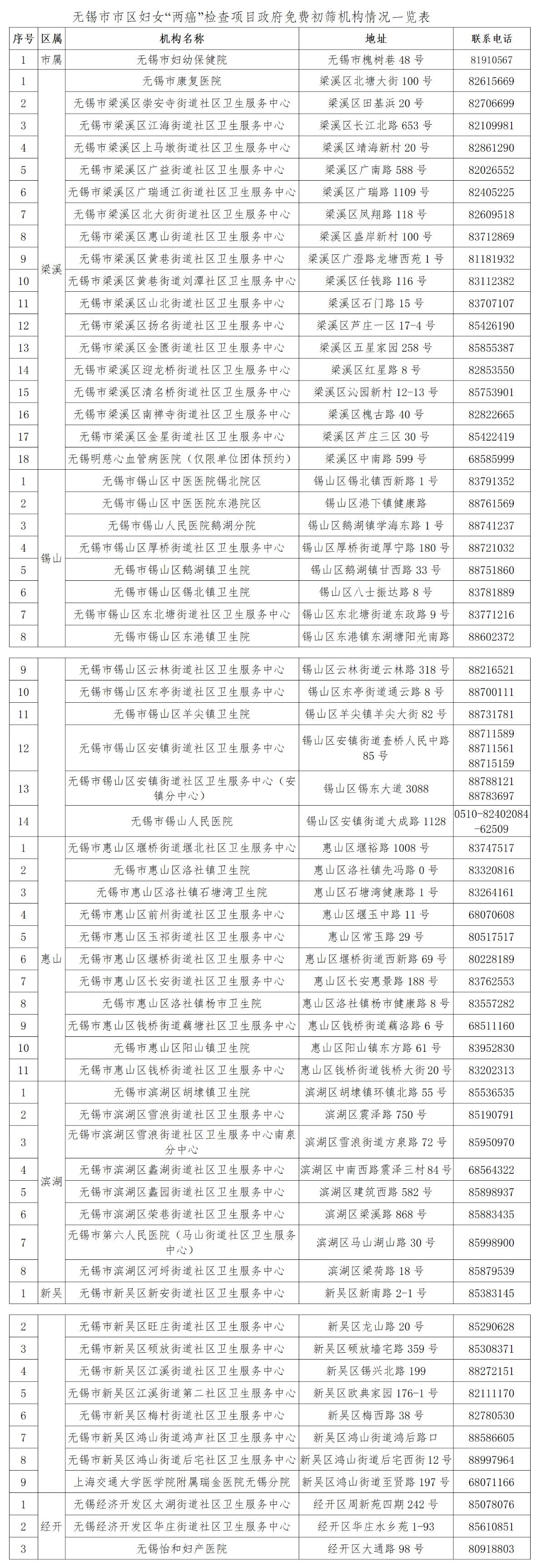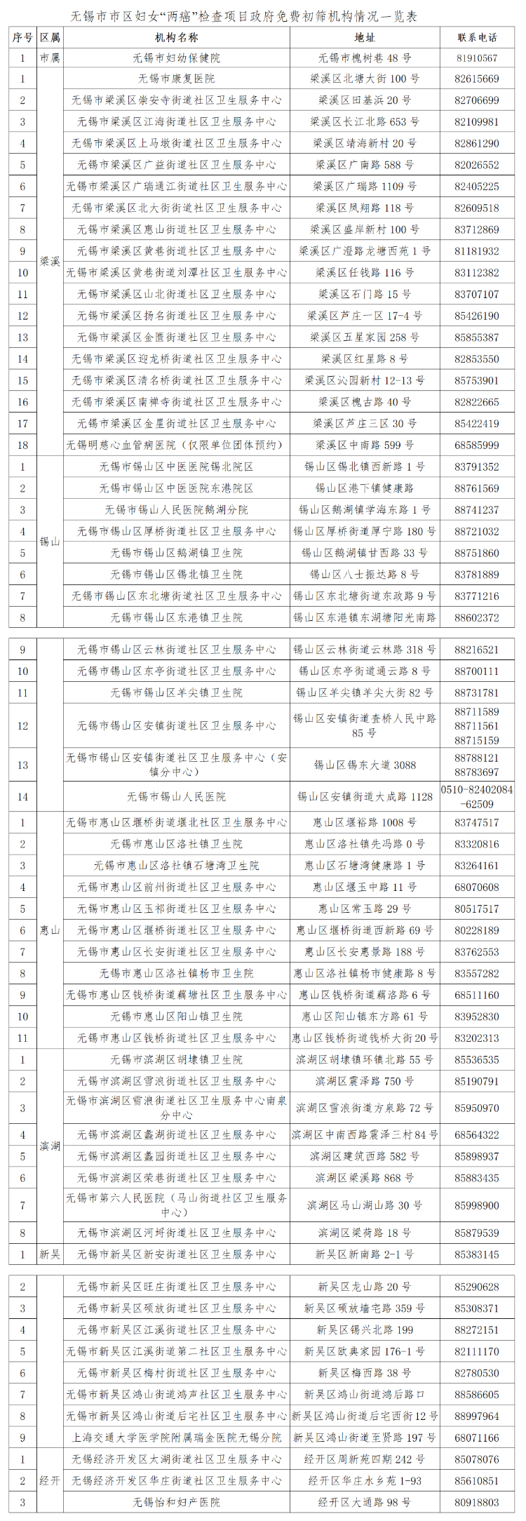 無錫市市區婦女“兩癌”檢查項目政府免費初篩機構情況一覽表