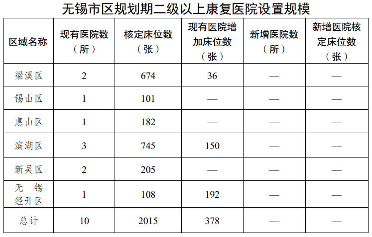 市區已設置康復醫院10所,其中三級公立康復醫院1所(無錫市中心康復醫院),二級公立康復醫院4所(含3所按二級醫院管理的基層醫療機構),社會辦二級康復醫院5所。到“十四五”期末,全市每千常住人口康復床位數達0.42張,二級以上綜合醫院均應開設康復醫學科,加強基層醫療衛生機構康復科建設,社區衛生服務中心和鄉鎮衛生院建立標準化康復醫療服務站(點)。鼓勵社會力量舉辦具有規模化、連鎖化的康復醫院。