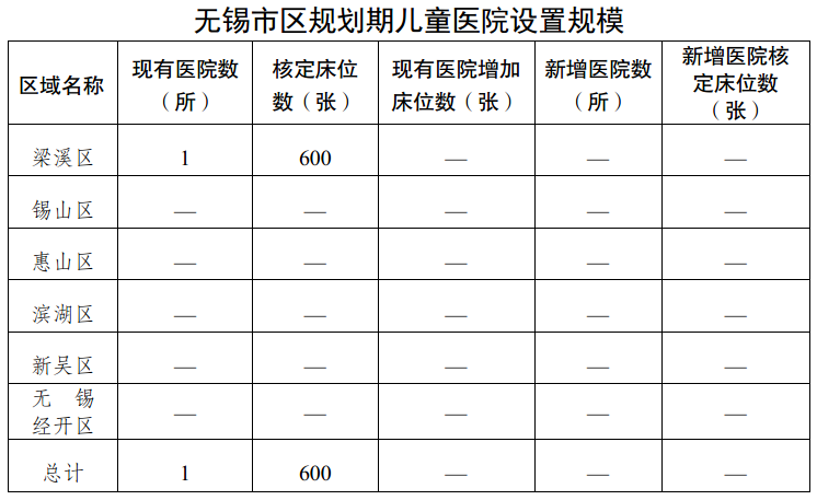 (1)兒童醫院:市區已設置三級公立兒童醫院1所(無錫市兒童醫院)。鼓勵社會力量舉辦二級及以上兒童醫院;各綜合醫院應加強兒科建設,所有二級及以上綜合醫院、中醫醫院、婦幼保健院、農村區域醫療衛生中心、社區醫院必須提供兒科門診服務,以滿足兒科醫療服務需求。