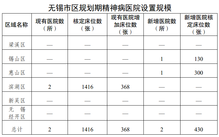 (4)精神病醫院:市區已設置三級公立精神病醫院1所(無錫市精神衛生中心),社會辦二級精神病醫院1所(無錫濟康精神病醫院)。到“十四五”期末,全市每千常住人口精神科床位數達0.37張,市區新設置二級公立精神病醫院2所(錫山區、惠山區各舉辦1所),市精神衛生中心完成精神衛生病房樓二期工程建設(建成后新增床位300張,總床位規模達1600張,含民政福利院400張);各二級及以上公立綜合醫院、農村區域性醫療中心、社區醫院應根據周邊群眾醫療需求開設精神科專科病房或精神科門診。鼓勵社會力量舉辦二級及以上精神病醫院。