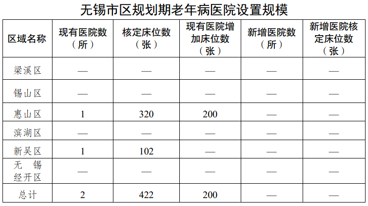 (10)老年病醫院:市區已設置老年病醫院2所,其中:三級公立老年病醫院1所(惠山區老年病醫院),社會辦二級老年病醫院1所(無錫明德老年病醫院);無錫市第二人民醫院掛牌無錫市老年病醫院。到“十四五”期末,市區85%的二級及以上公立綜合醫院設立老年醫學科,基層醫療衛生機構開展老年醫療服務;目前轄區尚無老年病醫院的常住人口在50萬以上的涉農區需在轄區1家老年病醫療服務能力強的公立二級綜合性醫院增掛老年病醫院;鼓勵社會力量舉辦二級及以上老年病醫院。