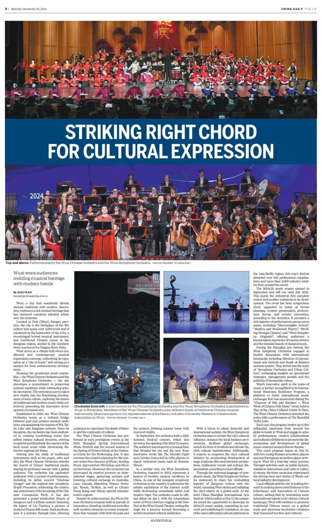 12月31日,中國香港歷史最悠久的中文財經報章《香港商報》整版刊登4000字綜述《“愛樂之城”無錫:與時代共振 讓“太湖之聲”響徹全球》,從音樂文化交流、城市音樂空間打造、音樂產業躍升、音樂藝術普及、民樂品牌煥新五個維度詳述無錫作為“愛樂之城”,如何以音樂講述動人的城市故事,構筑起與世界對話的橋梁。