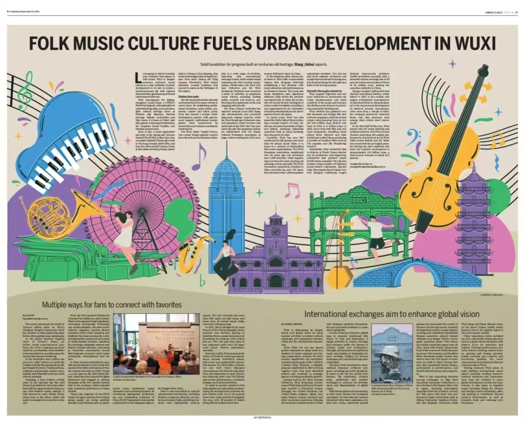 12月30日,《中國日報》刊發四聯版,以“千年音樂傳承,鑄就創新文化”為主題,借助原創手繪插畫等方式,從無錫燦若繁星的音樂名家、舉世聞名的樂器制造業、豐富多彩的民間音樂文化、頻繁多樣的中外文化交流等多角度,報道了無錫和音樂息息相關的故事。