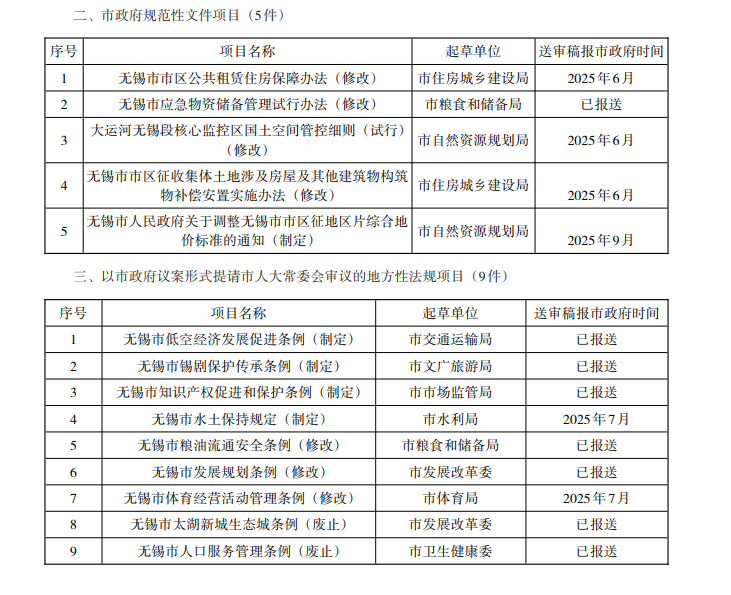 市政府辦公室關于印發無錫市人民政府 2025 年立法工作計劃的通知