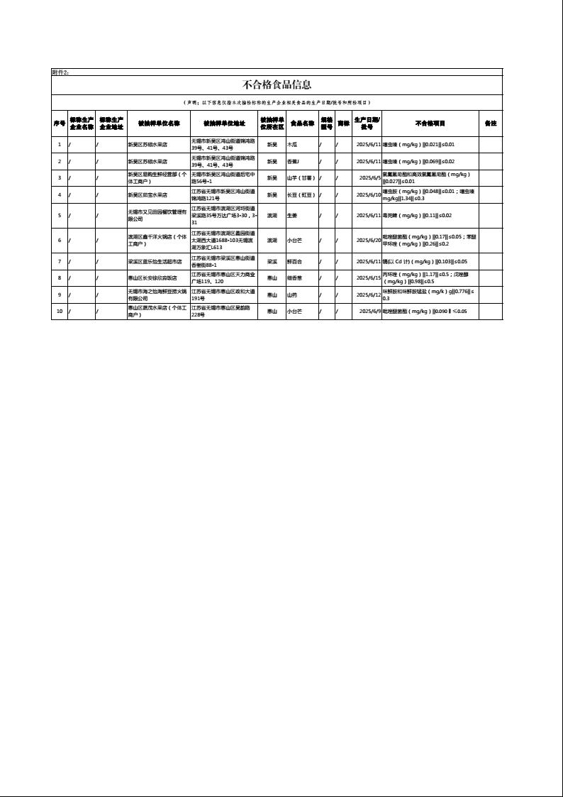 2025年7月,按照《2025年無錫市食品安全抽檢監測計劃》安排,無錫市市場監督管理局對無錫市食品生產、流通、餐飲全環節開展食品安全監督抽檢。現公示部分抽檢食品255批次,其中不合格10批次。公示的被抽檢食品范圍涉及食用農產品、調味品、乳制品、炒貨食品及堅果制品、餐飲食品、食用油、油脂及其制品等15個食品大類。(詳見附件)