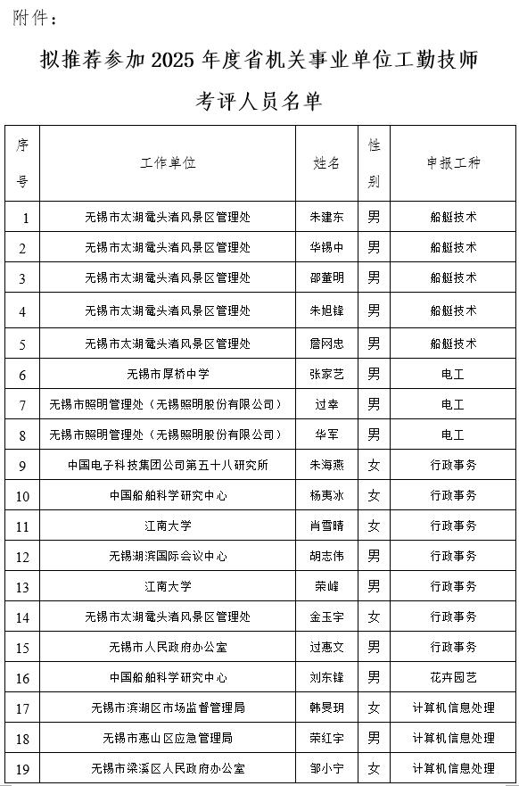 根據省人力資源社會保障廳《關于印發<江蘇省機關事業單位工勤技能崗位技術等級考評實施意見>的通知》(蘇人社發〔2024〕44號)、《省人力資源社會保障廳關于做好2025年全省機關事業單位工勤技能崗位技術等級考評工作的通知》(蘇人社函〔2025〕37號)以及《關于做好2025年全市機關事業單位工勤技能崗位技術等級考評工作的通知》(錫人社函〔2025〕12號)的文件精神,經個人申報、專家推薦,單位和主管部門初審、量化考評、擇優推薦,各市(縣)、區工考辦審核、市級復核和選拔考試等程序,擬推薦符合申報條件的人員共64人參加省技師培訓考評。(詳見附件),現予以公示。