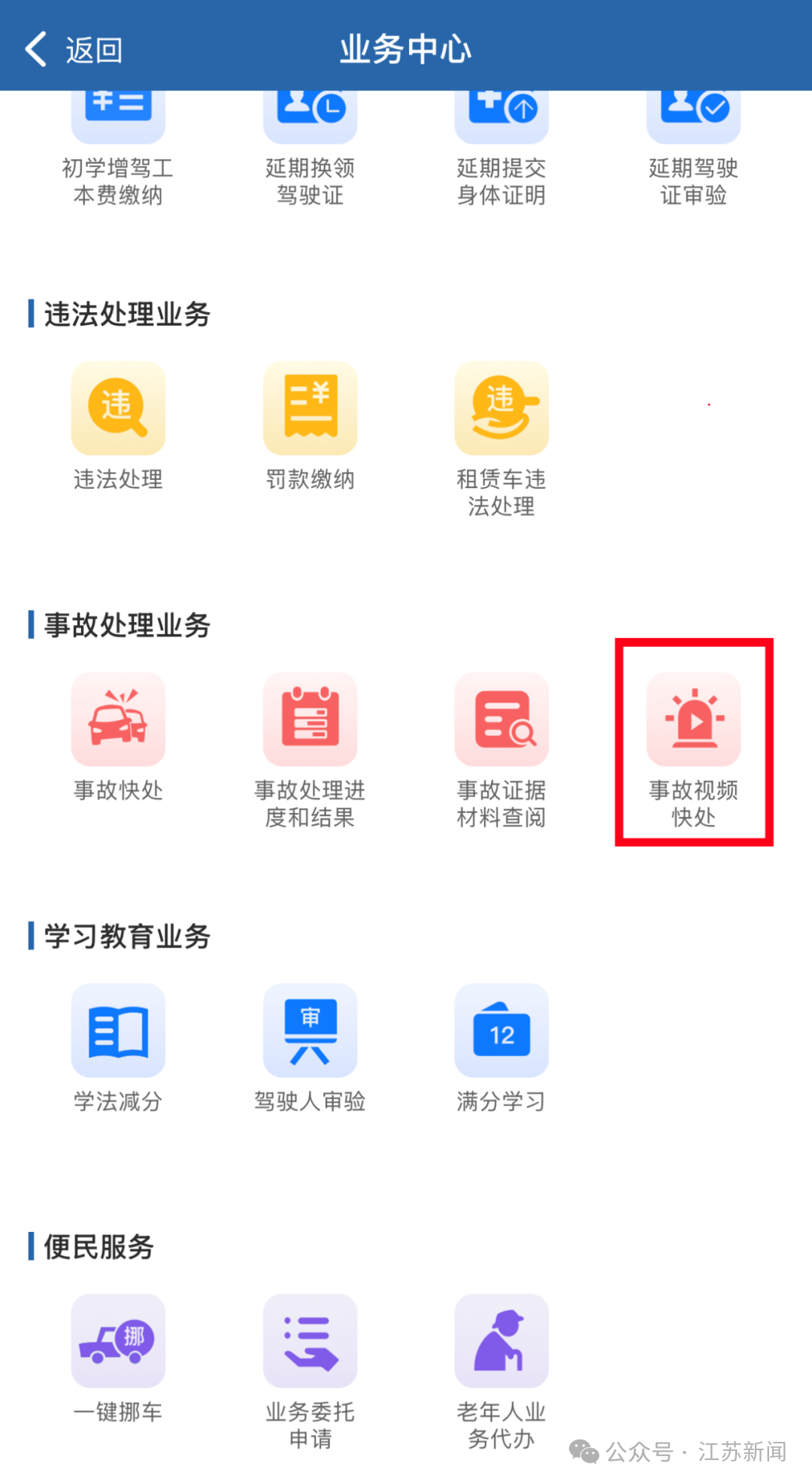 方法一:通過“江蘇交警”微信公眾號或者各地公安交管部門微信公眾號點(diǎn)擊“視頻快處”;