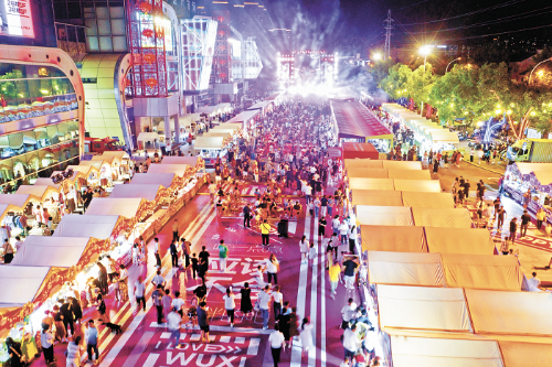 為有效把“蘇超”帶來的流量轉(zhuǎn)化為持久的經(jīng)濟動能,無錫配合賽事,利用多個商場、景區(qū)、戶外廣場大屏進行直播,打造遍布全城的“第二現(xiàn)場”,與城市空間、消費場景深度融合。大東方百貨不僅設(shè)置了兩處大屏直播點,更推出“跟著蘇超游無錫”主題活動;無錫招商城打造“夏日星空夜市”,有“蘇超”的周末客流量達上萬人次;宜興“網(wǎng)紅夜市”蛟橋河步行街里,足球激情與地攤經(jīng)濟碰撞出新火花……7—8月,中山路、長江路、太湖新城等多個市商務(wù)局重點監(jiān)測商圈銷售額實現(xiàn)同比兩位數(shù)增長,其中中山路商圈單月增幅超20%。