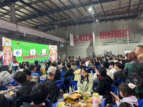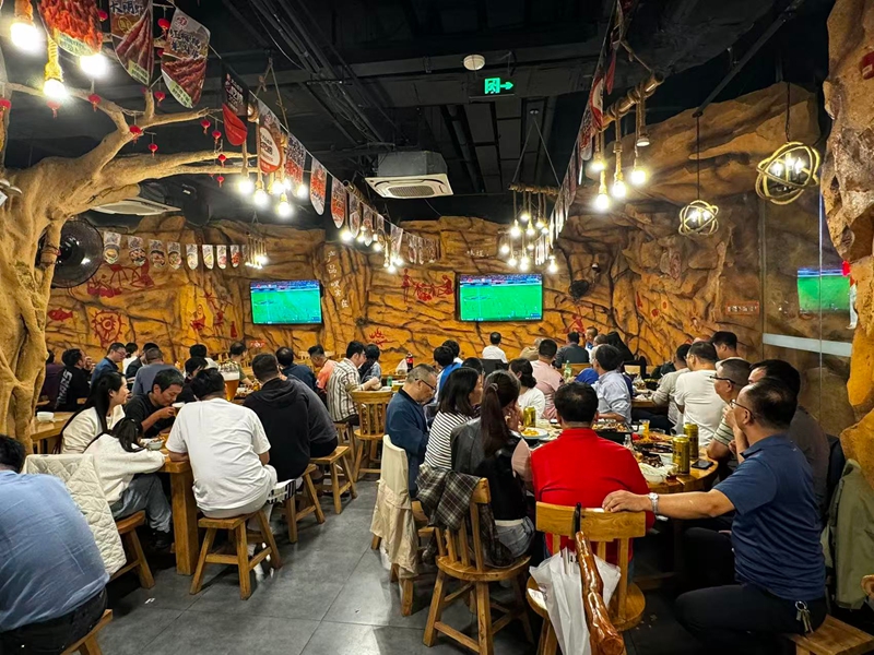 溪南公館大世界影城里也聚起不少觀賽的市民。李先生帶著孩子早早來到影廳中央位置,他們的臉上難掩期待:“我們家都喜歡足球,在電影院里看比賽,不僅有超大銀幕和震撼音效,還可以和球迷們交流,舒適度和氛圍感都很好。”觀賽活動不僅讓市民過足癮,也為商家帶來了實實在在的流量“紅利”。那天以后·重慶燒烤海鮮溪南公館店內座無虛席,客人們吃烤串、喝啤酒、看球賽,一起為無錫隊干杯,喝彩聲和歡笑聲此起彼伏。“客流量、酒水銷售額均比沒有賽事的普通周日增長了50%。”店長徐培生認為,“蘇超”這股熱勁把人氣實實在在帶到了線下。為讓廣大球迷更直觀感受“第二現場”氛圍,門店在大廳里裝了3塊直播大屏,在每個包廂里也都安排了電視直播,確保每個位置都能享受比賽。