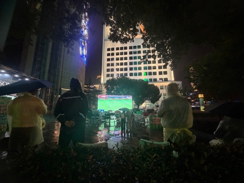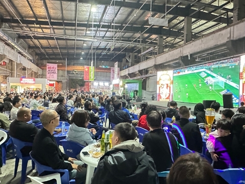在1969創意工場南方夜市,空氣里彌漫著油炸的焦香和沸騰的人聲,夜市中央的巨型大屏前座無虛席。賣舟山鐵板魷魚的潘先生忙得頭也不抬:“球迷們一邊吃一邊看,時不時還要點單,今天的生意比平時好了不少。”對面手打檸檬茶的攤位上同樣火爆,光檸檬就消耗了50斤,補了三四次茶葉,平時一晚上賣出三四桶,當天賽事剛開始,第六桶便已見底。南方夜市商家們在保證食品安全的基礎上全力增加了備貨量,保障球迷吃喝一應俱全。球迷顏亞鵬和3位朋友圍坐一起,桌上擺滿啤酒和烤串、炸薯條等各色小吃。“我們傍晚6點多就來占位子了,這種比賽,就得在夜市看,最有氛圍。”