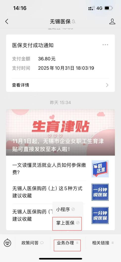以“無錫醫(yī)保”微信公眾號為例,關(guān)注公眾號進入主頁后,下方選擇“業(yè)務(wù)辦理”,點擊“掌上醫(yī)保”。