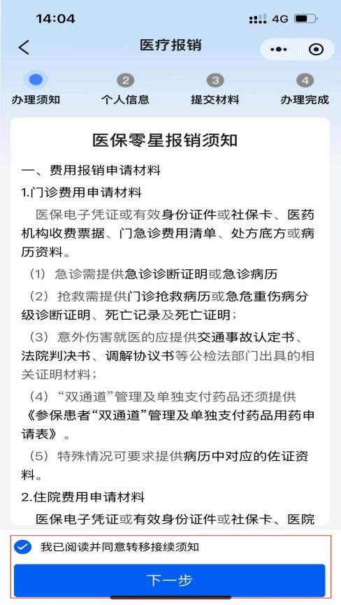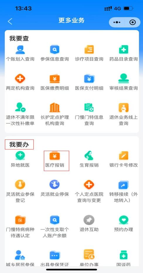 登錄個人賬戶后,點擊“更多”在“我要辦”模塊選擇“醫(yī)療報銷”,進入報銷界面,勾選報銷須知后點擊“下一步”。