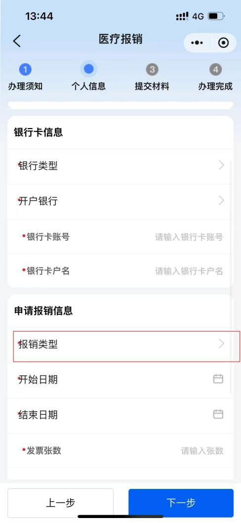 填寫個人信息,報銷類型可以選擇“門診費用報銷”或“住院費用報銷”。