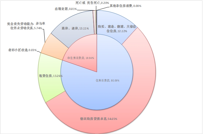 2024年一季度,住房消費(fèi)類提取金額為52.31億元,環(huán)比增長5.89%,占當(dāng)季提取額的80.06%。其中還貸提取占比最高,提取金額35.71億元,占當(dāng)季提取額的54.65%。具體提取結(jié)構(gòu)如下:
