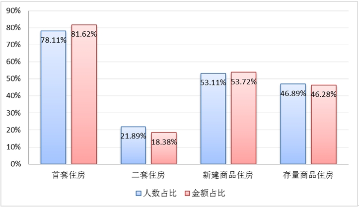 從貸款群體來看,剛需與改善型住房需求職工分別占貸款總?cè)藬?shù)的26.53%和67.73%。從單位性質(zhì)來看,以城鎮(zhèn)私營企業(yè)及其他城鎮(zhèn)企業(yè)職工為主,貸款筆數(shù)和貸款金額占比分別為57.09%、55.88%。從購房面積來看,職工貸款購買90(不含)-120㎡房屋居多,占貸款總?cè)藬?shù)的43.06%。從主借人繳存基數(shù)來看,貸款主要以中、低收入職工為主,分別占貸款總?cè)藬?shù)的26.55%、72.25%。從貸款類型來看,純公積金貸款和組合貸款占比分別為39.03%、60.97%。從貸款結(jié)構(gòu)來看,首套住房公積金貸款職工占貸款總?cè)藬?shù)的78.11%,二套住房公積金貸款人數(shù)占21.89%。具體放貸結(jié)構(gòu)如下: